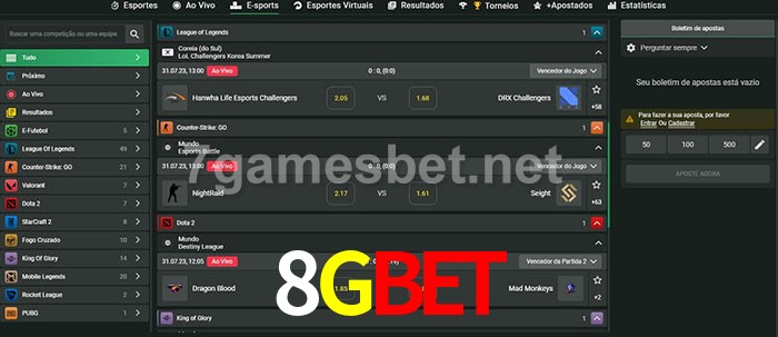 O 8Gbet oferece uma grande seleção de opções de apostas em e-sports com probabilidades competitivas